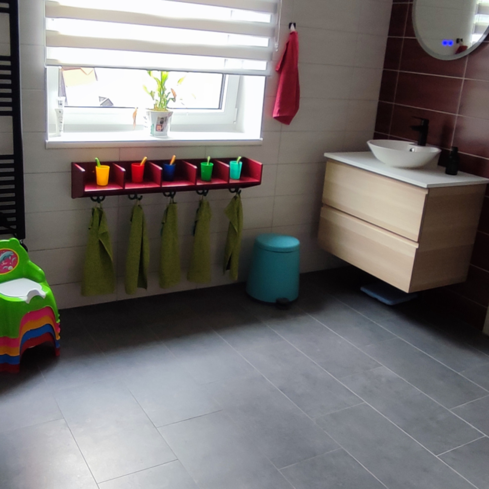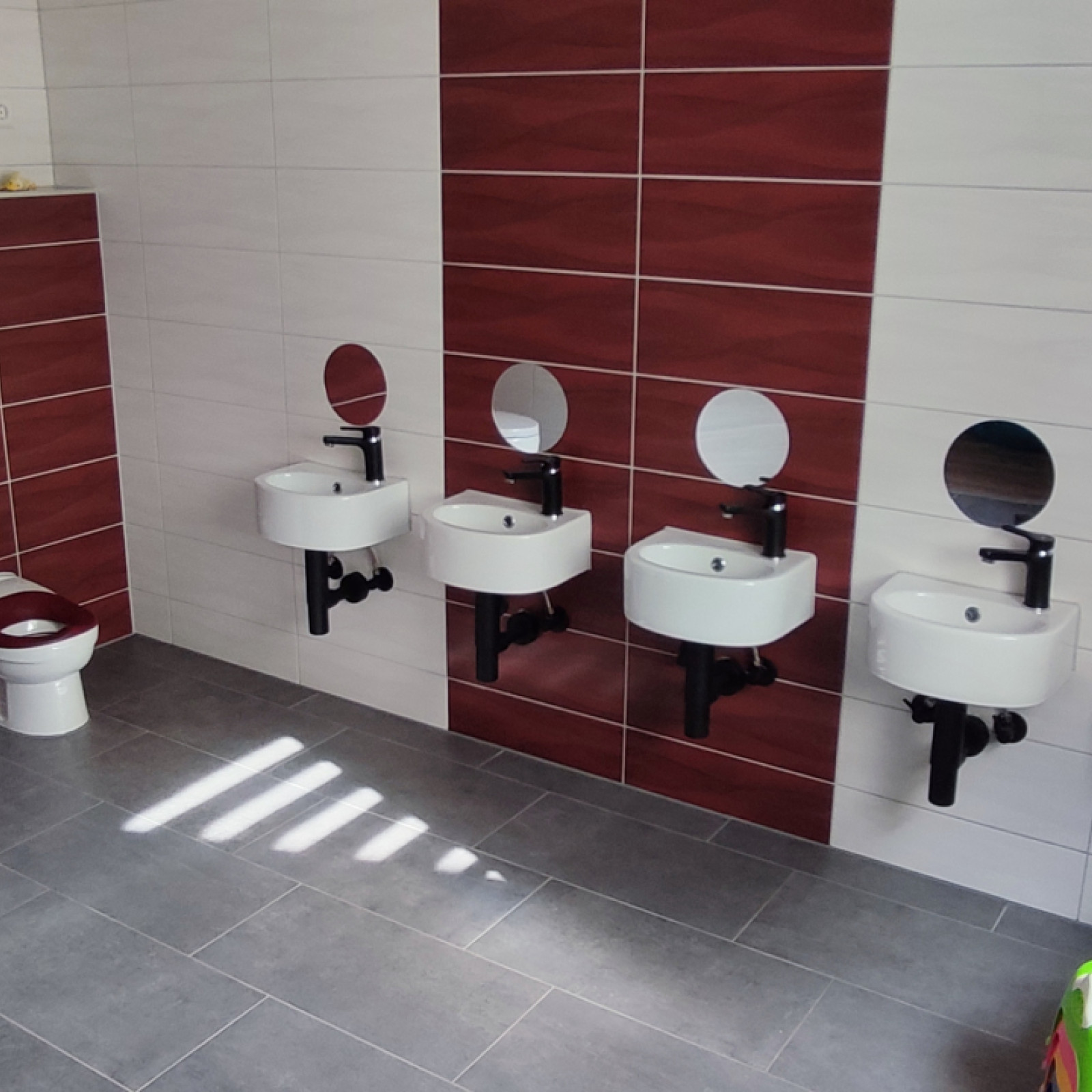 Im Badezimmer putzen wir Zähne und waschen uns die Hände an einem Waschbecken in Kinderhöhe. Ein Kinder WC gibt es ebenfalls.