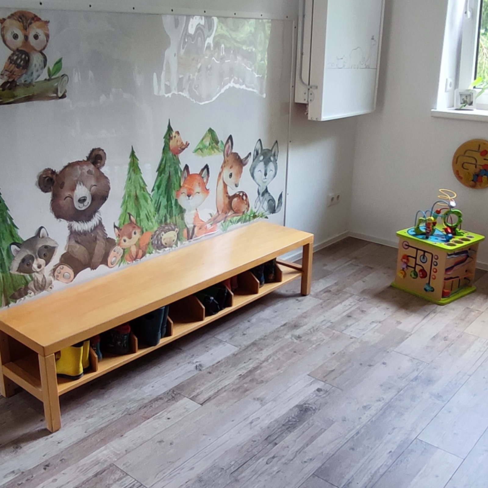 Im unteren Geschoss befindet sich eine kindgerechte Garderobe wo jedes Kind sein eigenes Fach für Wechselsachen, Schuhe und Jacke hat. Das mit einen jeweiligen Bild beklebt ist, somit weiß jedes Kind welches Fach zu ihm gehört.